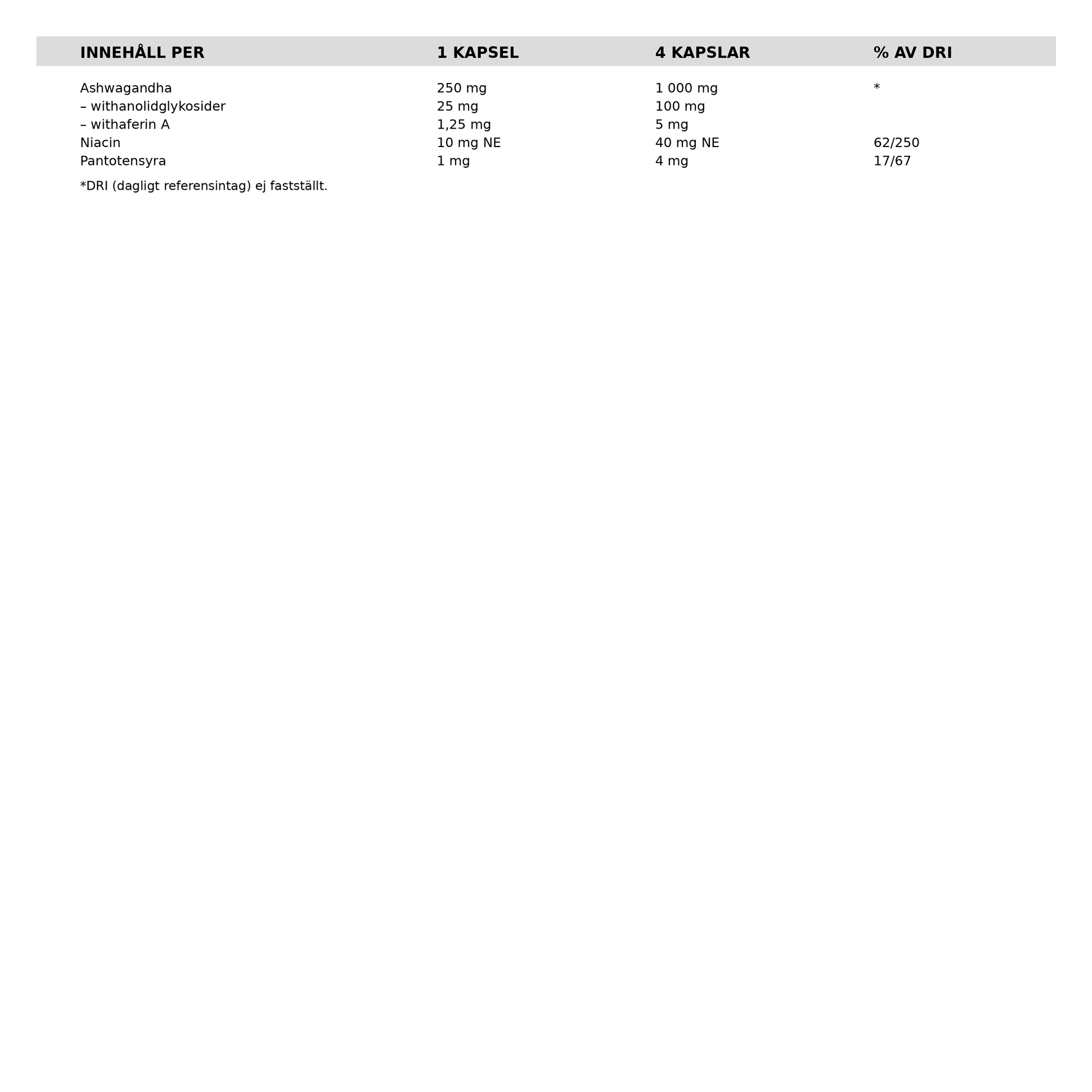 Ashwagandhaextrakt (Withania somnifera), Fyllnadsmedel (tapiokastärkelse), Fyllnadsmedel (tapiokastärkelse), Kapsel (pullulan), Nikotinamid, Svartpepparextrakt 95 % piperin (Piper nigrum, frukt), D-pantotenat kalcium, Klumpförebyggande medel (kiseldioxid)