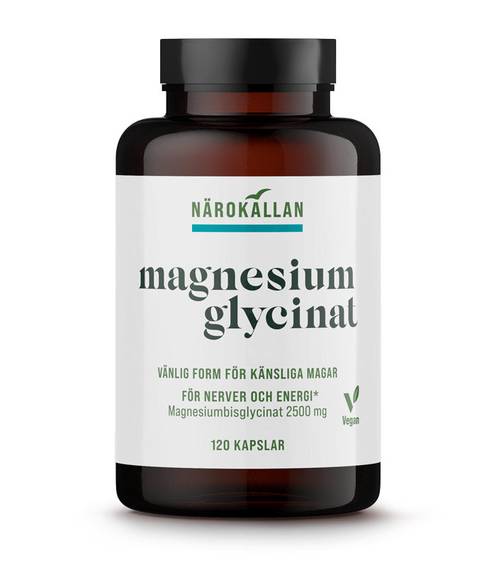 Magnesiumglycinat är en form av magnesium som är särskilt skonsam mot magen, vilket gör det idealiskt för personer med känsliga magar. Magnesium bidrar till att minska trötthet och utmattning, stödjer musklernas avslappning och nervsystemets normala funktion.