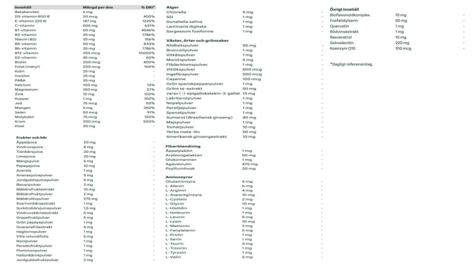 Rejäla doser av vitaminer och mineraler, ett aminosyrakomplex samt fiber och algkomplex plus bland annat resveratrol och Q10.