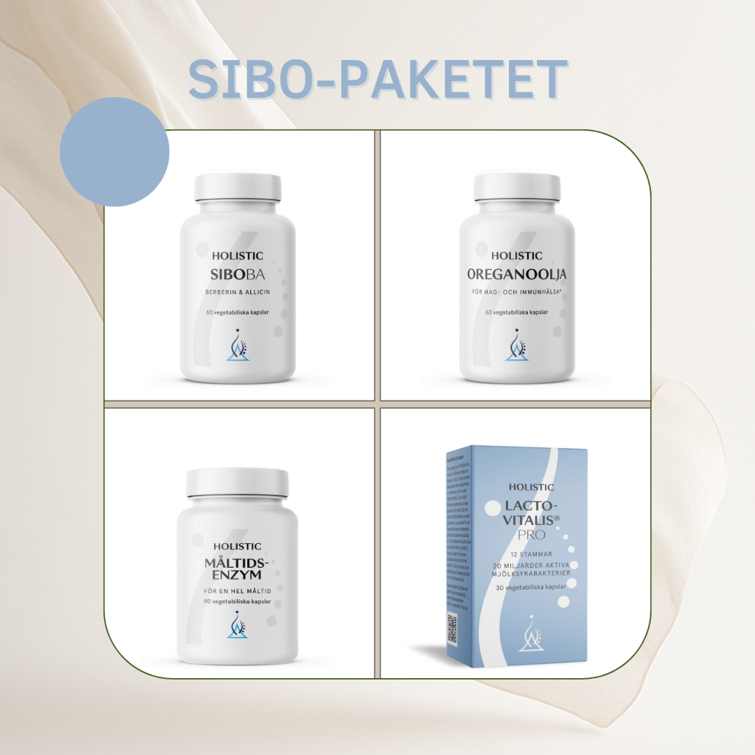 - Holistic SIBOba – Ett tillskott designat för att stödja en hälsosam bakterieflora i tunntarmen och lindra symtom på SIBO. Ett växtbaserat tillskott med berberin från berberisrot och allicin från vitlök som bidrar till att upprätthålla den mikrobiella balansen i tarmen.