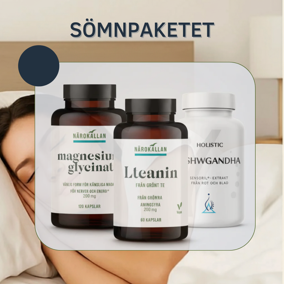 Sömnpaket är designat för att hjälpa dig att få en lugnare och mer vilsam sömn. Detta paket innehåller noggrant utvalda tillskott som Magnesium, L-Teanin och Ashwagandha, alla kända för sina lugnande och stressreducerande egenskaper. Dessa ingredienser arbetar tillsammans för att minska stress, främja avslappning och underlätta insomning, vilket kan resultera i en djupare och mer återhämtande sömn.